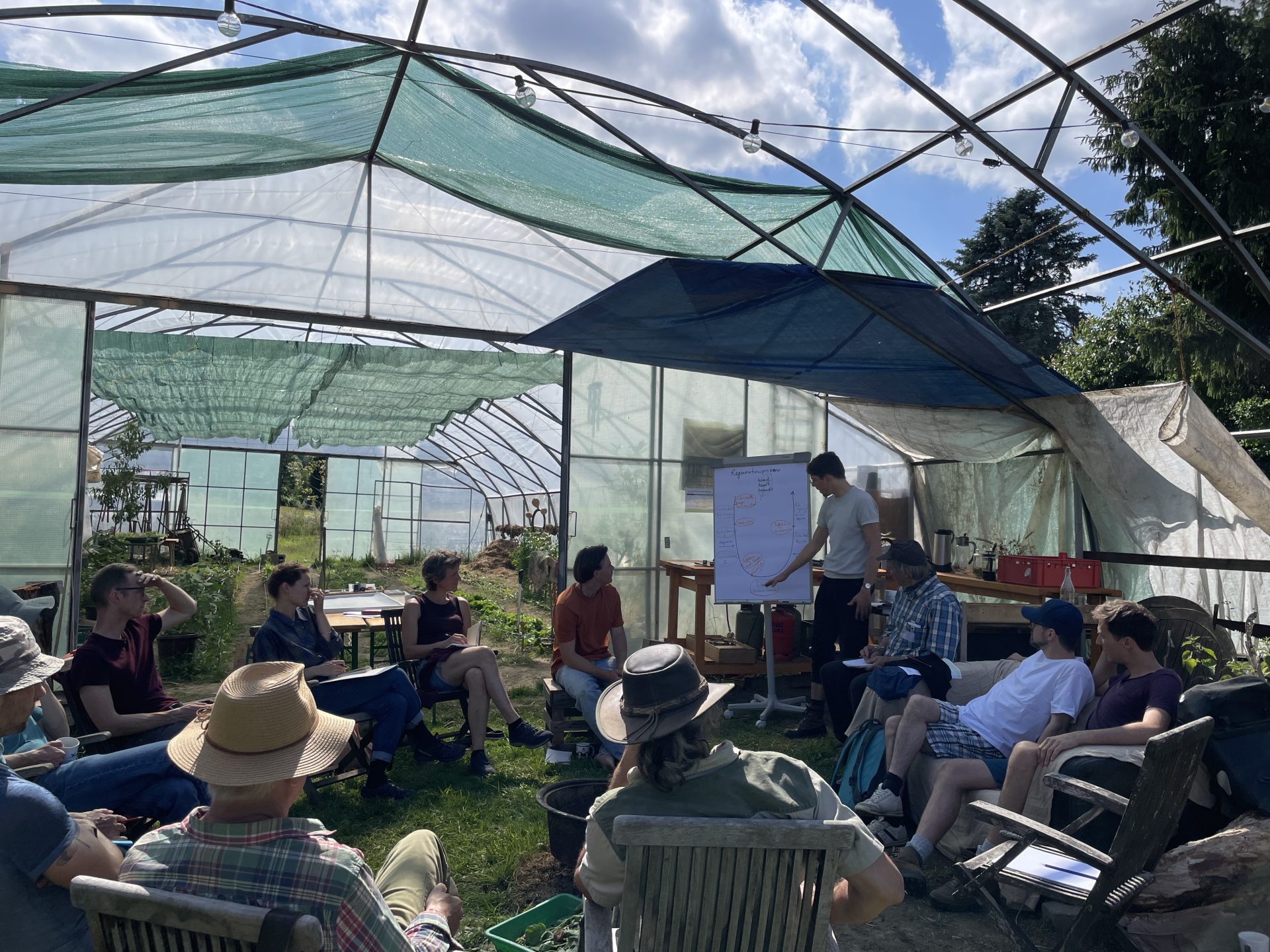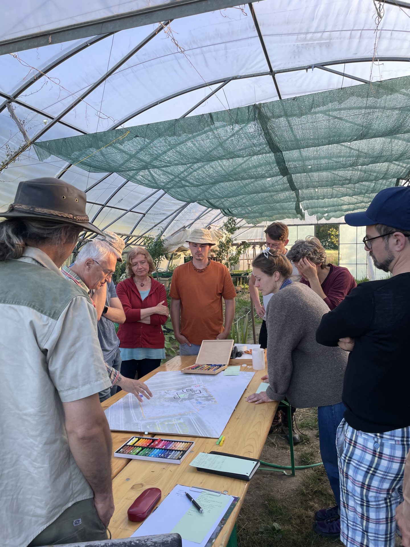 Mit den Landwirten und Gärtnern der Hofgemeinschaft, Studierenden der Landbauschule und externen Teilnehmenden wurden 10 Wasserretentionsmaßnahmen festgelegt. Schon jetzt ist ein sogenannter Bieberdamm umgesetzt und wir begleiten den Hof mit seinen weiteren Wasserretentionsprojekten.