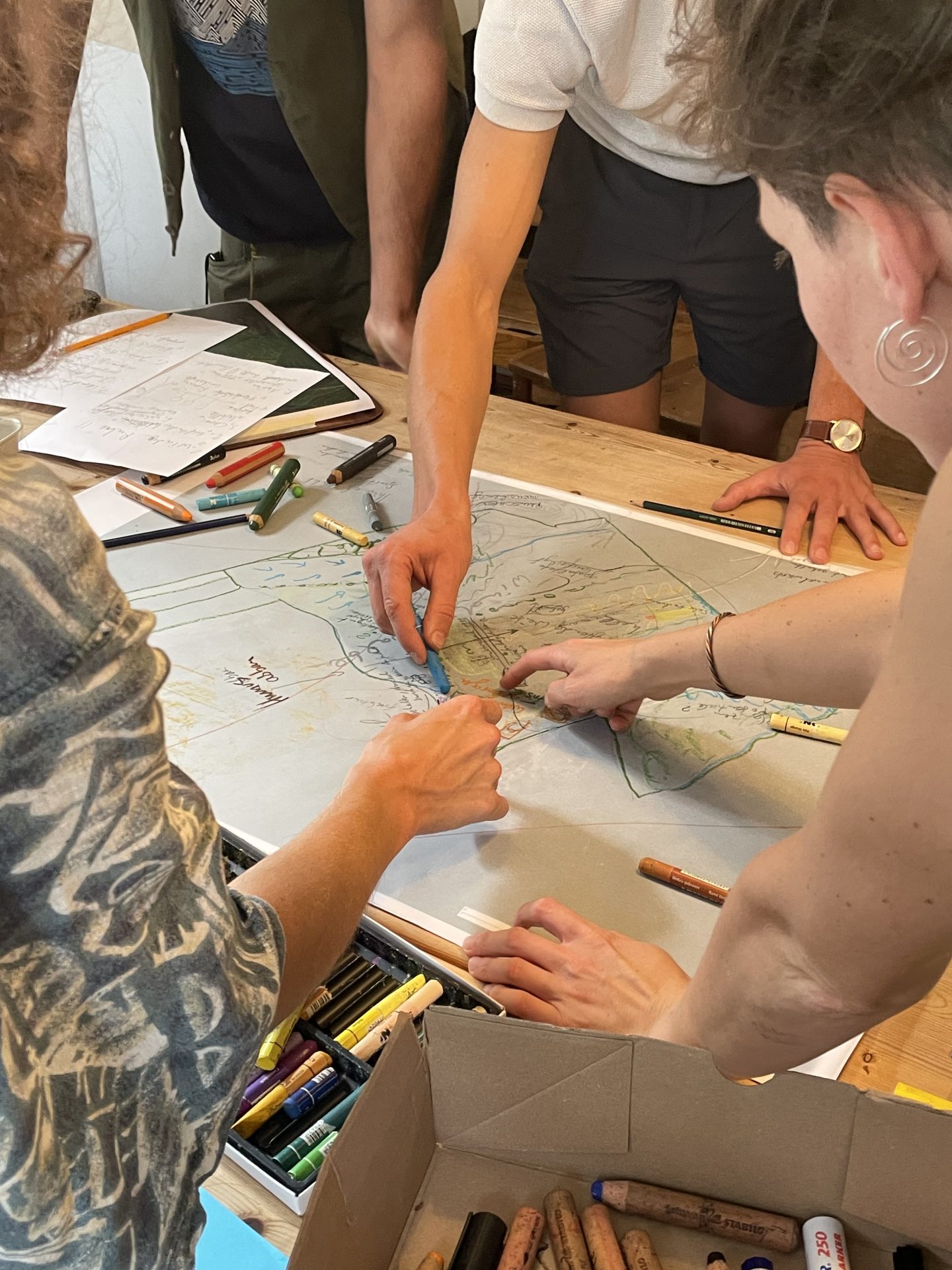 Bei unserem Train-the-Trainer-Seminar ging es ganz um die Arbeit mit der Wahrnehmung. Zusammen mit Praktiker*innen aus Ökologie und Kultur haben wir die Landschaft intensiv wahrgenommen und eine Potentialkarte erstellt. Jede*r konnte aus dem eigenen Themenbereich heraus beitragen und den Wahrnehmungsansatz auf die eigene Arbeit beziehen.